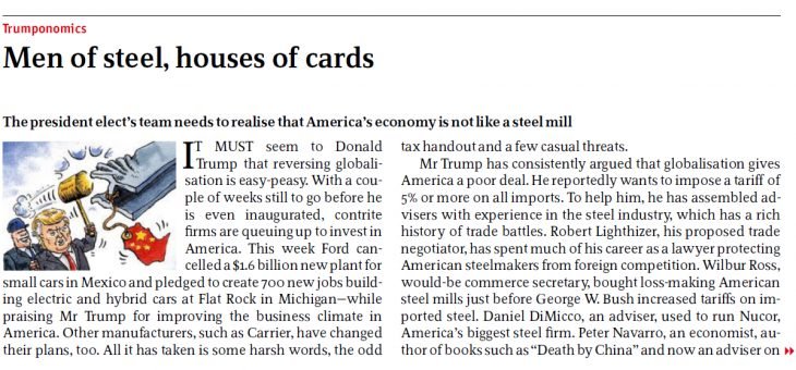 2017 年 1 月 7 日出版的《经济学人》第 8 页上有一篇很短的文章《钢铁人,纸牌屋》(Men of steel, houses of cards)。文中说,中国政府补贴国内行业,使得廉价的中国产品倾销国际市场,导致美国相关行业的工作机会流失,而美国当选总统特朗普(现已就任)则打算向从中国的进口产品征收关税。文章作者认为,对中国的钢铁等产品加税是正确的,但要是对苹果手机这类产品加税则是搞错了状况。文章有一句说: